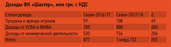 "Шахтер" участвовал в групповом этапе Лиги чемпионов и вышел в 1/8 финала турнира. Доходы клуба от УЕФА и ФИФА составили 888 миллионов гривен.