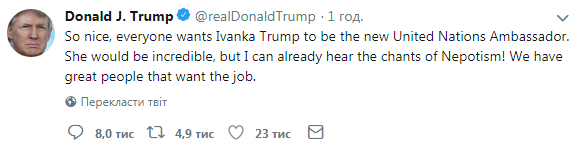 "Так здорово, все хотят видеть Иванку Трамп постоянным представителем США при ООН. Она была бы невероятной, но уже сейчас я слышу обвинения в непотизме! У нас есть отличные люди, которые хотят работу", - написал Трамп.