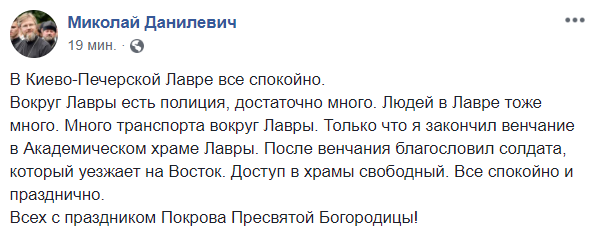 13:30  "В Киево-Печерской Лавре все спокойно", - пишет в Facebook представитель УПЦ МП Николай Данилевич.