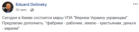 13:50  "Сегодня в Киеве состоится марш УПА "Вернем Украину украинцам". Предлагаю дополнить: "фабрики - рабочим, землю - крестьянам, деньги - евреям"", - комментирует сегодняшний марш глава Украинского еврейского комитета Эдуард Долинский.