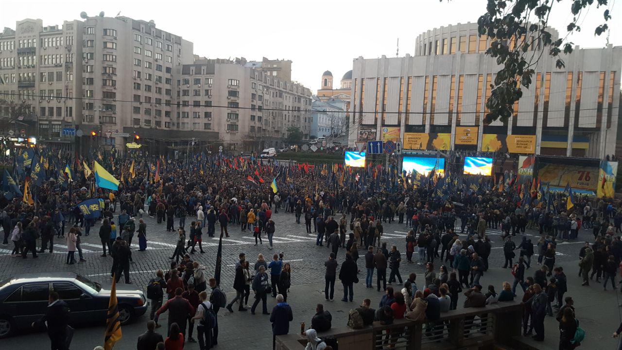 15:01  Людей уже порядка 5-6 тысяч. Националисты взяли памятник Шевченко, где находится сцена, в оцепление, куда пропускают прессу.