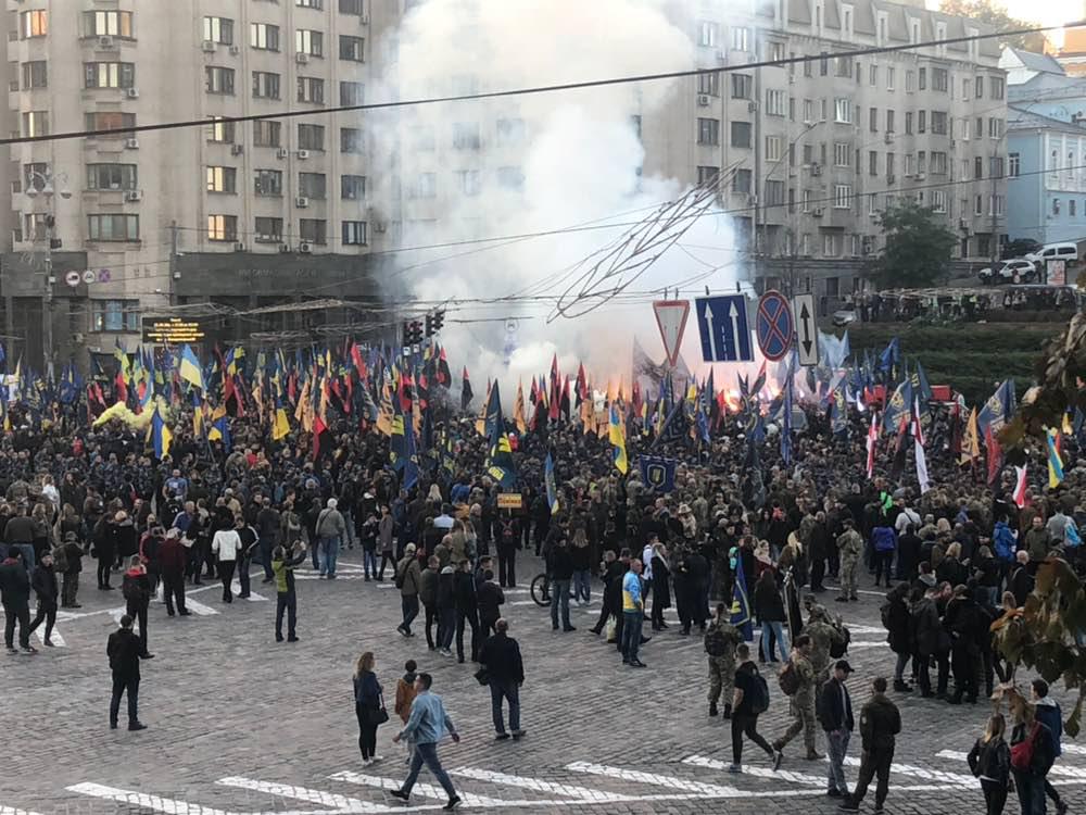 17:05  Вся колонна националистов окутана дымом. Кричат "Бандера наш герой".