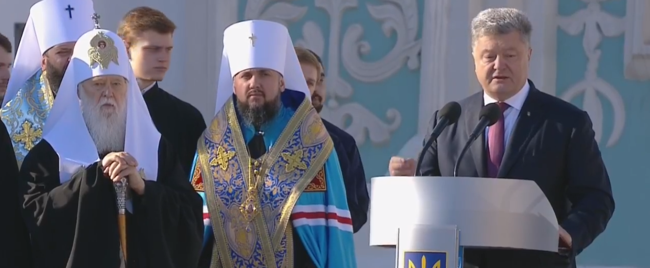 9:52  Порошенко говорит, что пройдет Архиерейский собор, где изберут предстоятеля Единой поместной церкви. Из УПЦ МП будет "группа епископов", заявил Порошенко.