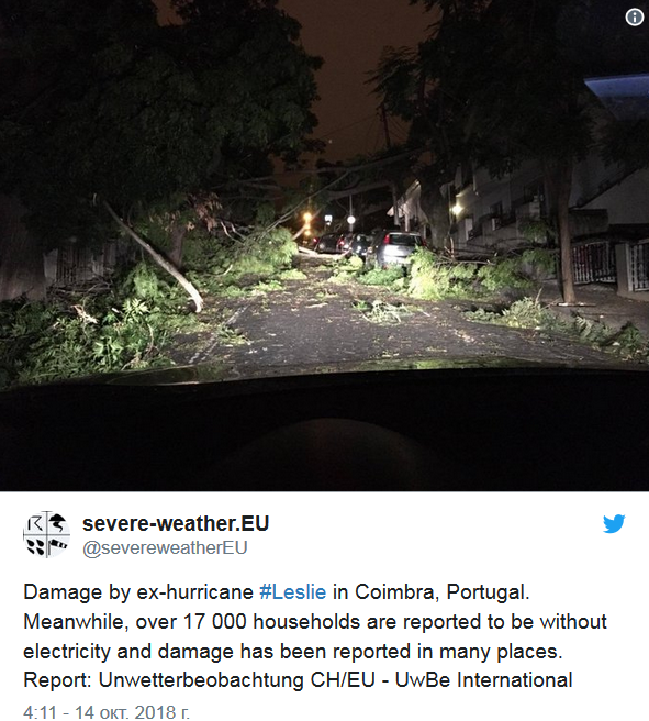 Ранее считалось, что шторм "Лесли", сформировавшийся еще 23 сентября, станет сильнейшим для Португалии за последние 150 лет. Однако он ослаб до того, как достиг португальских берегов.