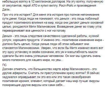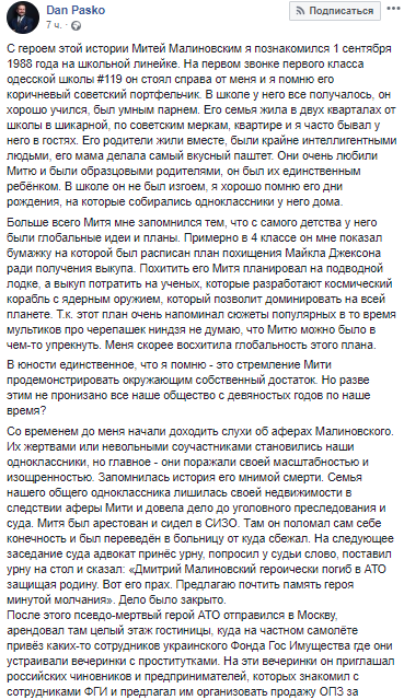 "Запомнилась история его мнимой смерти. Семья нашего общего одноклассника лишилась своей недвижимости в следствии аферы Мити и довела дело до уголовного преследования и суда. Митя был арестован и сидел в СИЗО. Там он поломал сам себе конечность и был переведен в больницу, откуда сбежал. На следующее заседание суда адвокат принес урну, попросил у судьи слово, поставил урну на стол и сказал: "Дмитрий Малиновский героически погиб в АТО, защищая родину. Вот его прах. Предлагаю почтить память героя минутой молчания". Дело было закрыто.