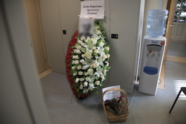 На венке была надпись "Денис Коротков - предатель Родины"; корзина с головой барана содержала записку "Главному редактору "Новой газеты" с приветом Вам и Короткову" (орфография и пунктуация автора сохранены).