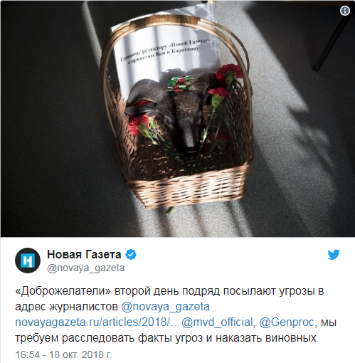 В четверг, 18 октября, к зданию, в котором находится редакция российской "Новой газеты" подбросили корзину с отрезанной головой барана. Днем ранее туда принесли похоронный венок. В заявлении редакции "Новой газеты" расценили оба "подарка" как угрозы в адрес журналиста издания Дениса Короткова.