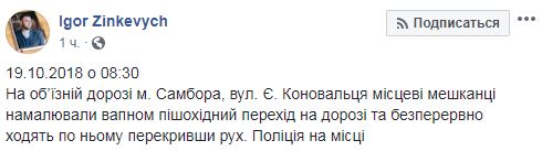 Сегодня, 19 октября, около 50 жителей Самбора во Львовской области перекрыли улицу Коновальца (объездная дорога) с требованием отремонтировать ее. Об этом сообщил депутат Львовского горсовета, глава общественной организации "Варта 1" Игорь Зинкевич в Facebook.