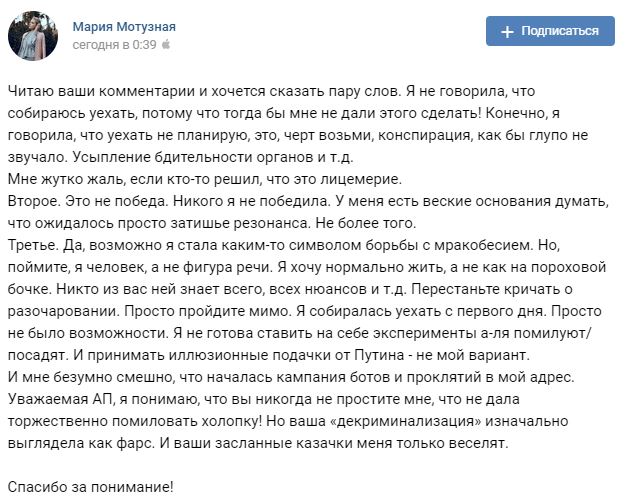 Студентка из Барнаула Мария Мотузная, которую обвиняли в экстремизме за картинки в соцсетях, объяснила свой отъезд из России в Украину желанием "нормально жить, а не как на пороховой бочке", однако оставаться в Украине не будет. Об этом она написала в соцсетях.