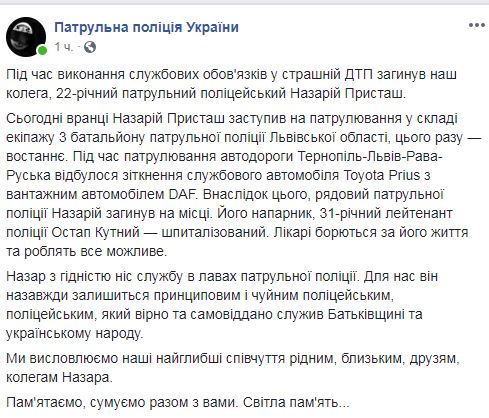 "Сегодня утром Назарий Присташ заступил на патрулирование в составе экипажа 3 батальона патрульной полиции Львовской области, на этот раз - в последний раз. Во время патрулирования автодороги Тернополь-Львов-Рава-Русская произошло столкновение служебного автомобиля Toyota Prius с грузовым автомобилем DAF", - сообщили правоохранители.