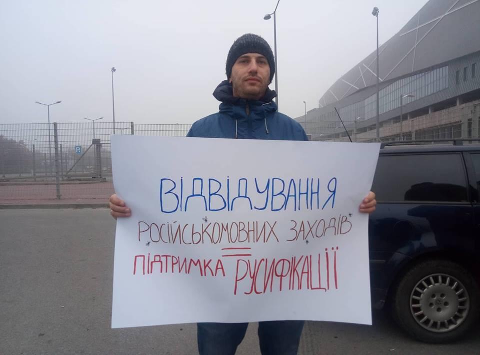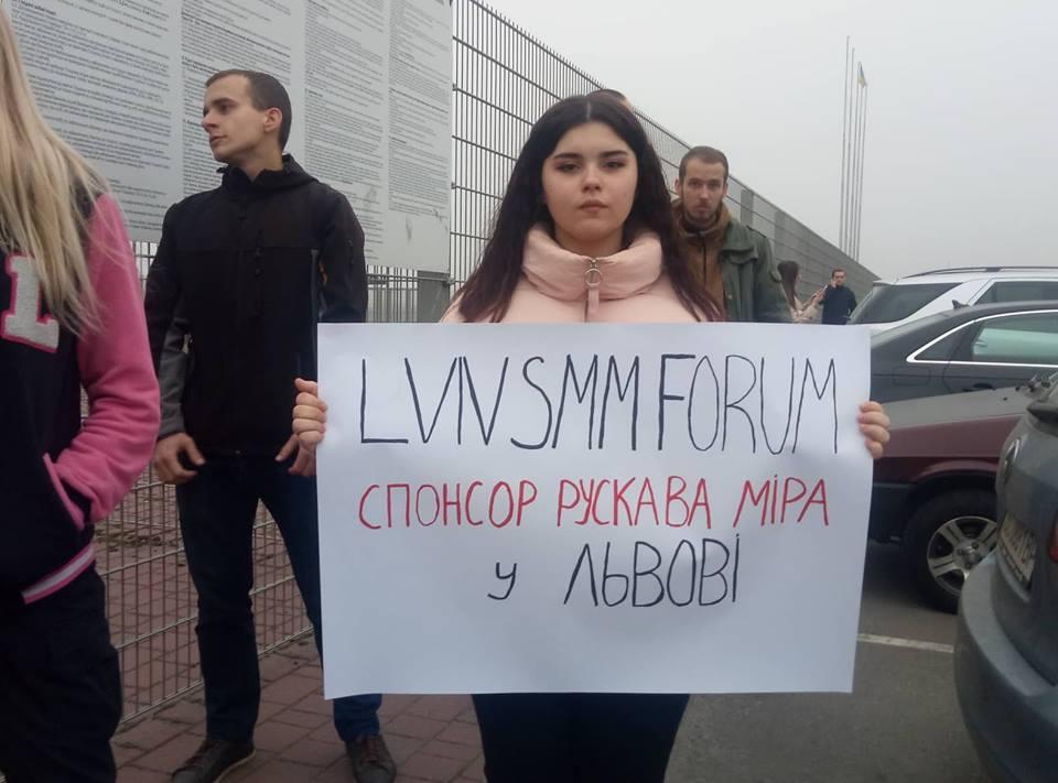 У входа на "Арену Львов" стояли около 20 человек, которые пикетировали LVIV SMM FORUM IV. Организатор акции протеста "Львоф не ґаваріт па русски!" Андрей Сывохип рассказал, что он уже не первый год добивается, чтобы выступления лекторов форуме переводили на украинский язык, однако организаторы мероприятия его постоянно игнорируют.
