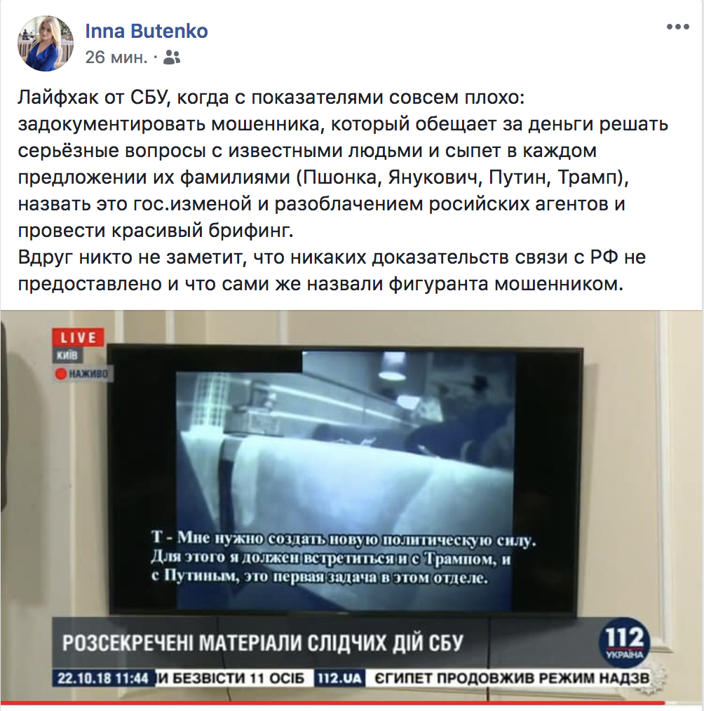 "Лайфхак от СБУ, когда с показателями совсем плохо: задокументировать мошенника, который обещает за деньги решать серьёзные вопросы с известными людьми и сыпет в каждом предложении их фамилиями (Пшонка, Янукович, Путин, Трамп), назвать это гос.изменой и разоблачением росийских агентов и провести красивый брифинг, - пишет на своей странице в ФБ адвокат Инна Бутенко. - Вдруг никто не заметит, что никаких доказательств связи с РФ не предоставлено и что сами же назвали фигуранта мошенником".