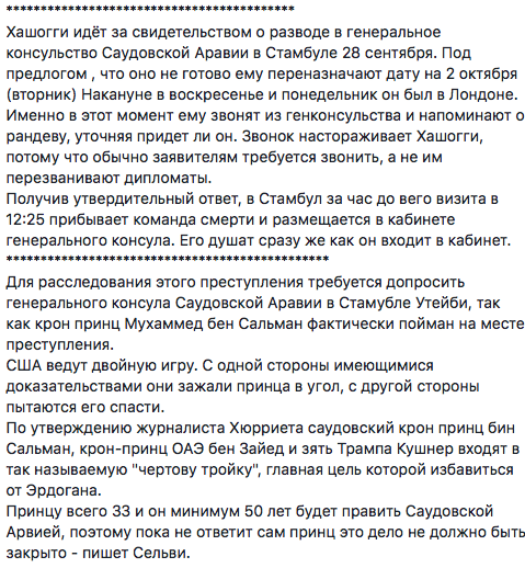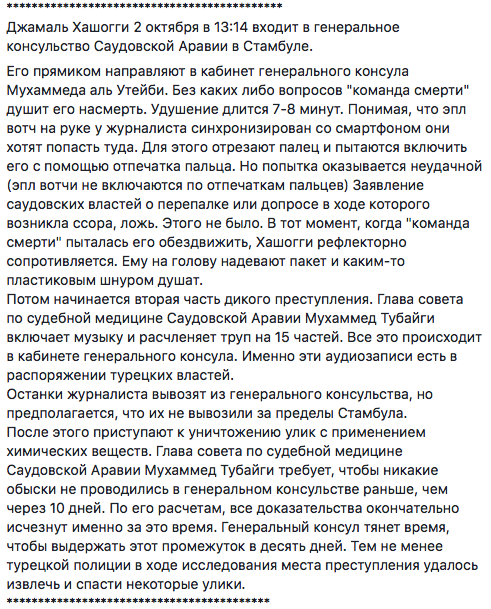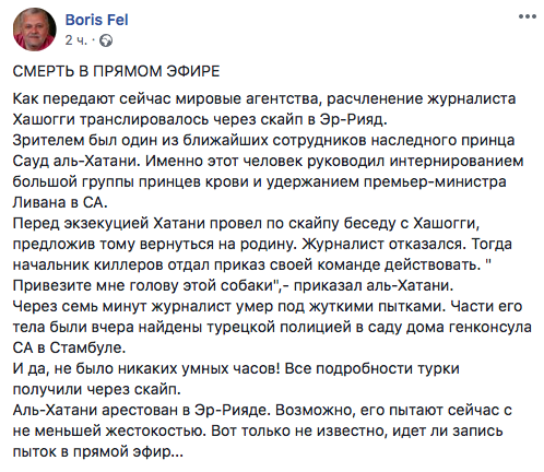 "Как передают сейчас мировые агентства, расчленение журналиста Хашогги транслировалось через скайп в Эр-Рияд.