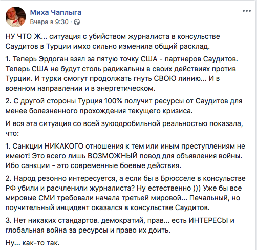 В разных формулировках озвучивается следующий тезис: представьте, какие бы санкции последовали в отношении РФ, если бы высокопоставленный российский генерал отправил 15 человек убивать российского журналиста в консульство страны за рубежом. При этом в отношении саудитов - никакой реакции.