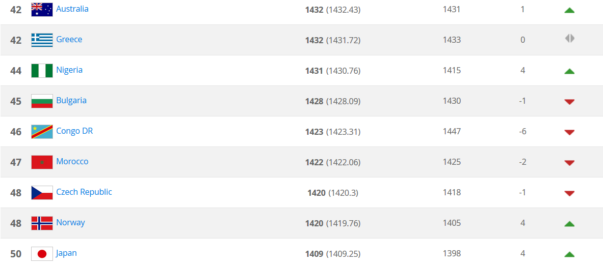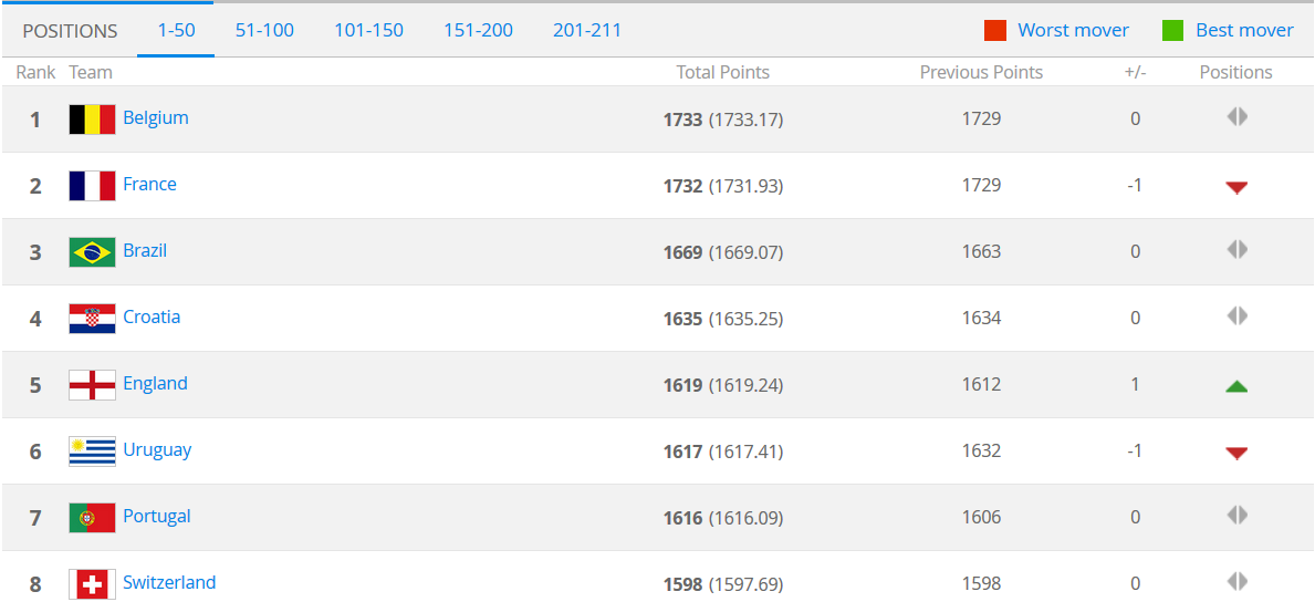 А вот на вершине рейтинга смена лидера - сборная Бельгии потеснила с первого места чемпионов мира, сборную Франции. Пентакампеоны - третьи, а сборная России идет на 47 месте.