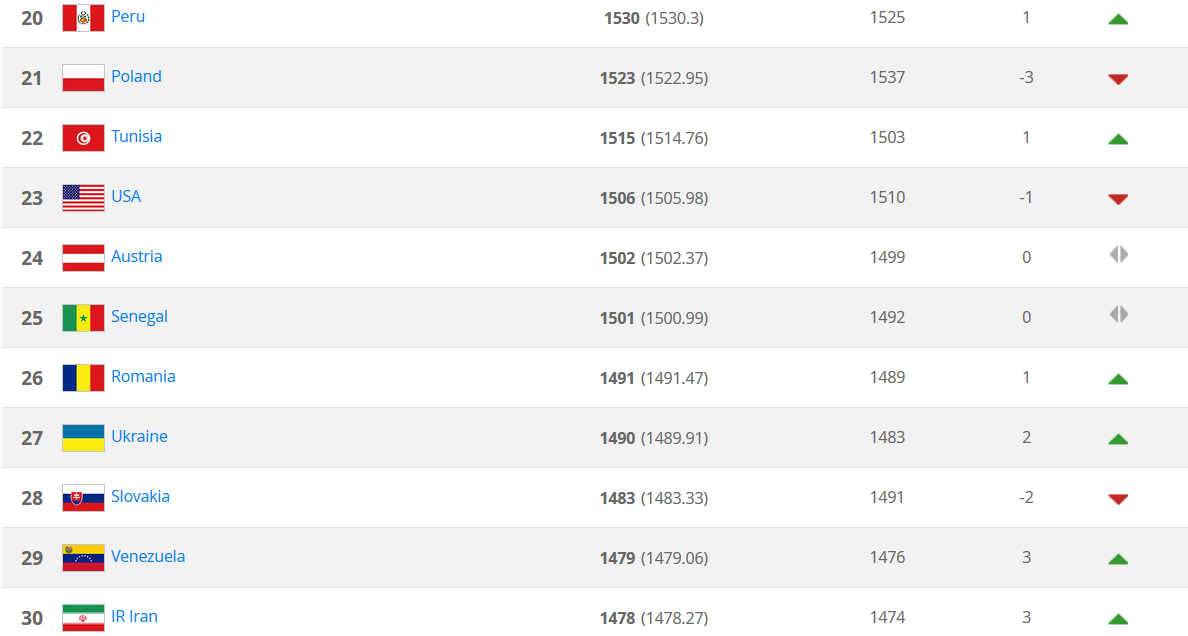 Сборная Украины, благодаря своим победам в Лиге Европы улучшила свой рейтинг и поднялась на две строчки вверх. Теперь наша команда занимает 27 позицию.