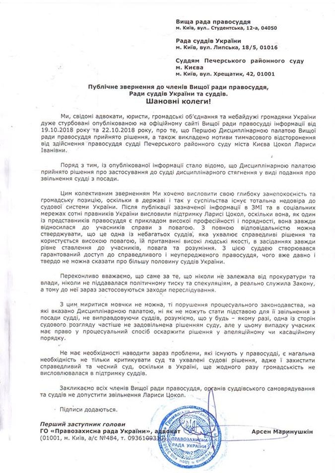Инициатором обращения стал столичный адвокат Арсен Маринушкин, открывший сбор подписей в адрес Высшего совета правосудия,  Совета судей Украины и судей Печерского района Киева.