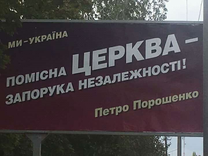 Петр Порошенко в продолжение кампании "Армия - Язык - Вера" разместил билборд, касающийся поместной церкви. Правда, на этот раз был выбран другой фон - не синий, а коричневый.