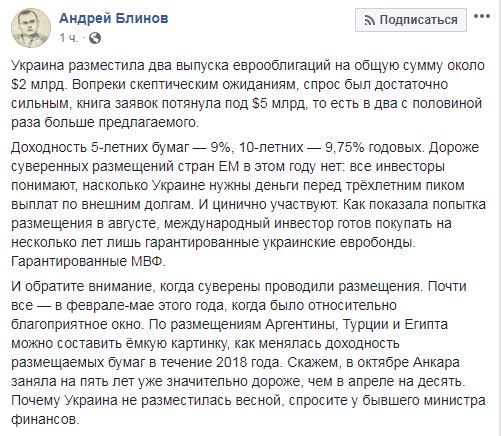 "Дороже суверенных размещений стран ЕМ в этом году нет: все инвесторы понимают, насколько Украине нужны деньги перед трехлетним пиком выплат по внешним долгам, - пишет экономист Андрей Блинов в Facebook. - И цинично участвуют. Как показала попытка размещения в августе, международный инвестор готов покупать на несколько лет лишь гарантированные украинские евробонды. Гарантированные МВФ".