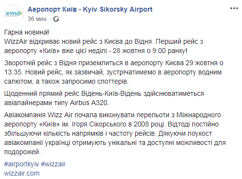 Авиакомпания WizzAir открывает новый рейс из Киева в Вену. Об этом сообщает пресс-служба аэропорта "Киев" на странице в Facebook.