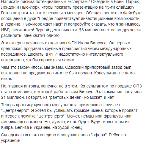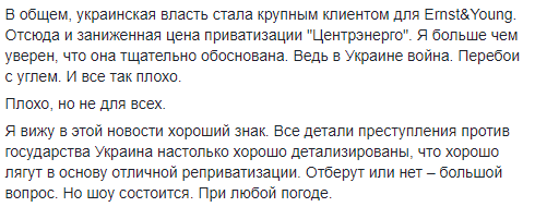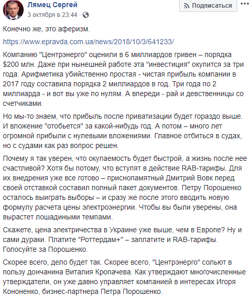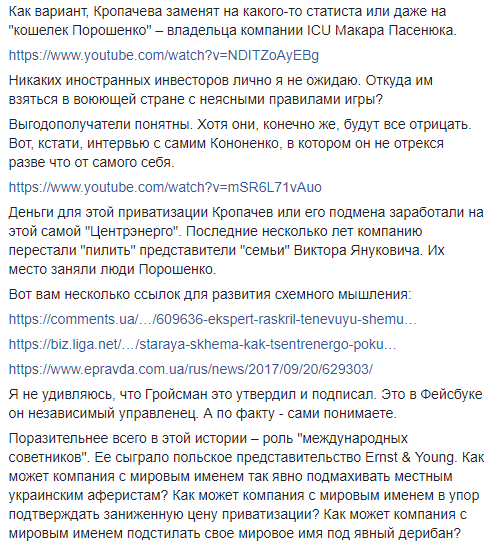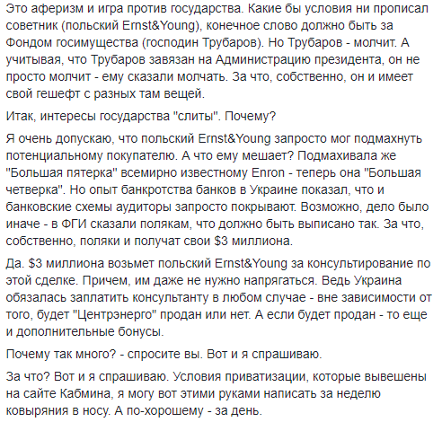 "Скорее всего, "Центрэнерго" сольют в пользу Виталия Кропачева, который уже давно управляет компанией в интересах Игоря Кононенко, бизнес-партнера Петра Порошенко, - пишет Лямец. - Деньги для этой приватизации Кропачев или его подмена заработали на этой самой "Центрэнерго". Последние несколько лет компанию перестали "пилить" представители "семьи" Виктора Януковича. Их место заняли люди Порошенко".