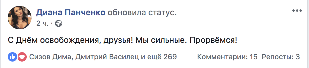 А ведущая телеканала NewsOne (который власти угрожают закрыть) Диана Панченко опубликовала краткое, но вполне понятное поздравление: "с Днём освобождения, друзья! Мы сильные. Прорвёмся!".