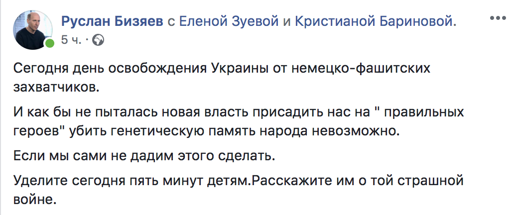 "Сегодня день освобождения Украины от немецко-фашитских захватчиков. И как бы не пыталась новая власть присадить нас на " правильных героев" убить генетическую память народа невозможно. Если мы сами не дадим этого сделать. Уделите сегодня пять минут детям.Расскажите им о той страшной войне", - призывает блогер Руслан Бизяев.
