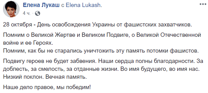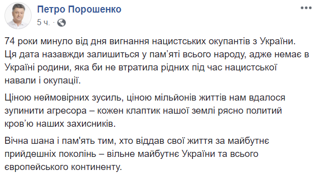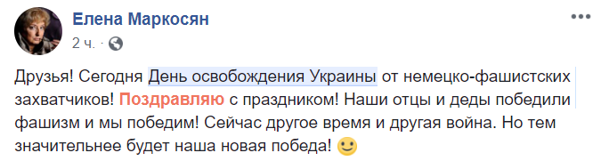 "Друзья! Сегодня День освобождения Украины от немецко-фашистских захватчиков! Поздравляю с праздником! Наши отцы и деды победили фашизм и мы победим! Сейчас другое время и другая война. Но тем значительнее будет наша новая победа!"
