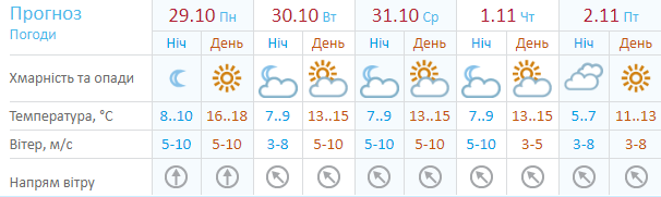 А вот ресурс Мeteoprog.ua обещает, что с 29 по 31 октября в Киеве будет тепло до +19. Далее температура снизится до +13...+16 днем. В субботу возможен слабый дождь.
