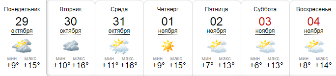 По данным сайта Sinoptik.ua, первые два дня недели будут пасмурными, в среду возможен дождь. Далее выглянет солнце. Температура +15...+16 до пятницы, а с 2 ноября +13. Ночью +6...+10.