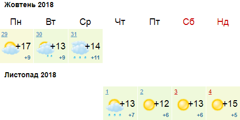 Сайт Weather.com обещает, что в первой половине недели будет преимущественно пасмурно, но без осадков. Затем в Киеве проглянет солнце. Конец октября ознаменуется температурой +16...+17. С 1 ноября воздух станет прохладнее на пару градусов: +14...+15. На выходных переменная облачность без дождя, +14...+15.