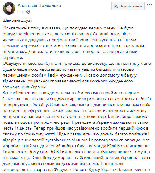 Украинская певица Анастасия Приходько сообщила 29 октября в Facebook, что намерена присоединиться к команде главы партии "Батьківщина" Юлии Тимошенко.
