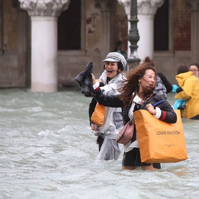 В Венеции несмотря на непогоду и затопленные улицы много людей. Они передвигаются по городу в высоких резиновых сапогах, чемоданы и сумки носят на плечах. Кстати, наводнение не помешало провести в городе запланированный марафон. Спортсмены храбро бежали прямо по затопленным улицам.