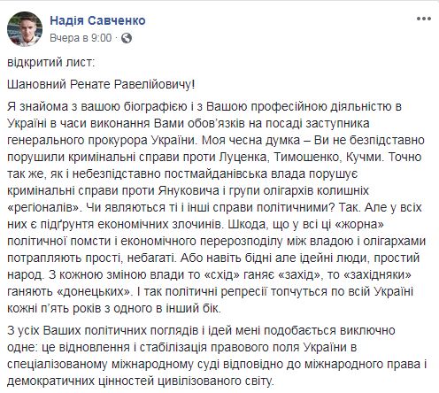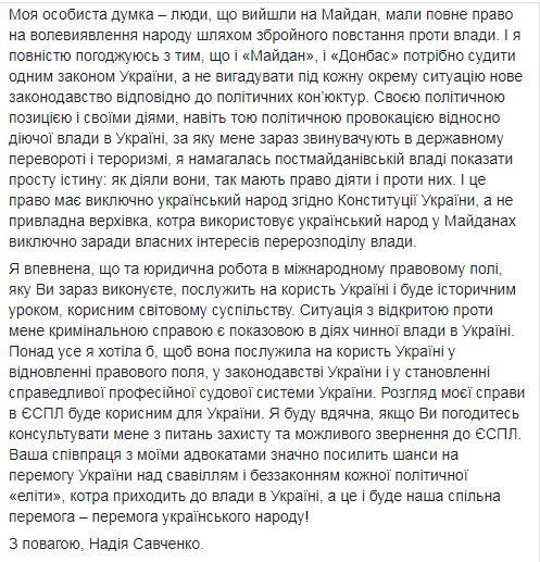 Савченко также отметила: "Из всех Ваших политических взглядов и идей мне нравится исключительно одно: это восстановление и стабилизация правового поля Украины в специализированном международном суде в соответствии с международным правом и демократическими ценностями цивилизованного мира. Мое личное мнение – люди, вышедшие на Майдан, имели полное право на волеизъявление народа путем вооруженного восстания против власти. И я полностью согласна с тем, что и "Майдан" и "Донбасс" нужно судить одним законом Украины, а не выдумывать под каждую отдельную ситуацию новое законодательство в соответствии с политической конъюнктурой".