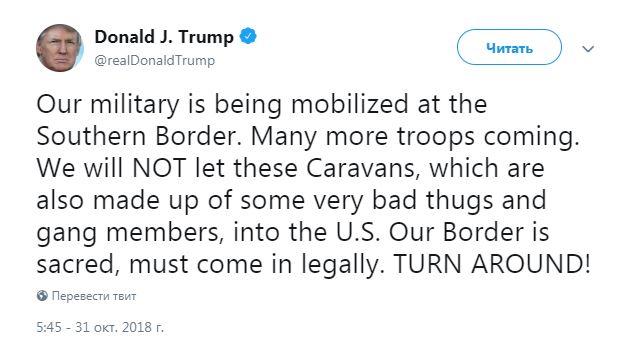 "Наши военные мобилизованы на южной границе. В скором времени там будет еще больше войск. Мы не пропустим в США эти колонны, в которые входят преступники и члены банд", - написал Трамп. "Наша граница священна, и пересекать ее можно только легально. Поворачивайте назад", - добавил он.