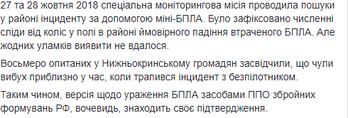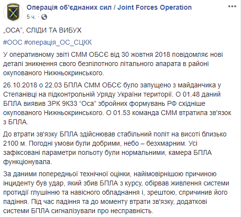 Штаб операции Объединенных сил заявляет, что потерянный 27 октября в Донецкой области беспилотный летательный аппарат СММ ОБСЕ, который наблюдал за колонной грузовиков из России, был сбит войсками противовоздушной обороны России. Об этом сообщает пресс-центр ООС в Facebook.