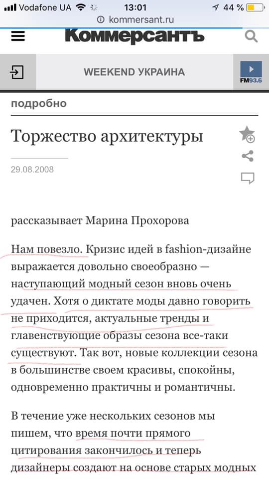 Первым плагиат заметил киевский Телеграм-канал "Київ Фэшн Лавэз". Он заметил, что исходный текст был разве что слегка сокращен, да и несколько слов было написано от себя. Остальное оказалось идентичным.