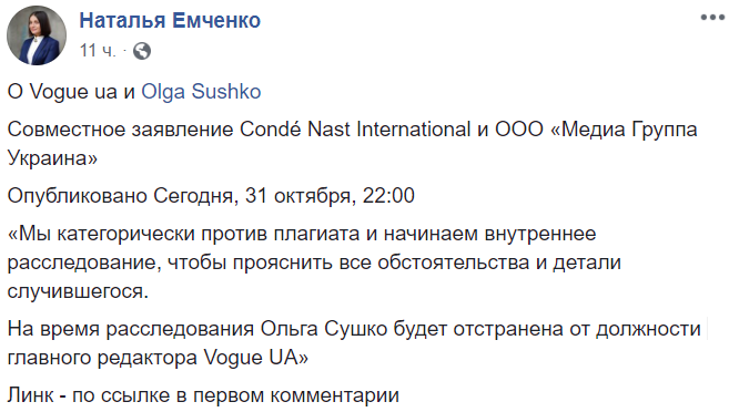 Владелец журнала – медиагруппа "Украина" Рината Ахметова – уже признала факт воровства чужих матералов и заявила о временном отстранении главного редактора "Vogue-Украина" – Ольги Сушко.