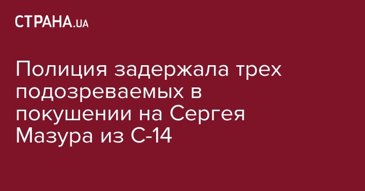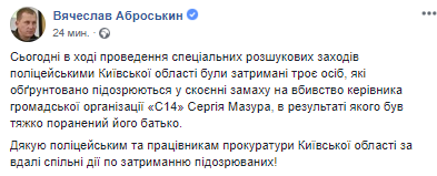 "Сегодня в ходе проведения специальных розыскных мероприятий полицейскими Киевской области были задержаны три человека, которые обоснованно подозреваются в совершении покушения на убийство руководителя общественной организации "С14" Сергея Мазура, в результате которого был тяжело ранен его отец", - написал в соцсети полицеский руководитель.