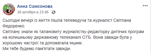 "Светлану знали как талантливую журналистку-редактора детских программ на бывшем государственном телеканале ОТБ. Она всегда была в хорошем настроении и помогала другим. Мы тебя будем помнить всегда", - написала Самсонова.