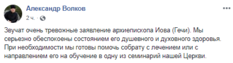 По его словам,  в РПЦ обеспокоены состоянием "душевного и духовного здоровья" архиепископа. "Звучат очень тревожные заявления архиепископа Иова (Гечи). Мы серьезно обеспокоены состоянием его душевного и духовного здоровья", - сказал Волков.
