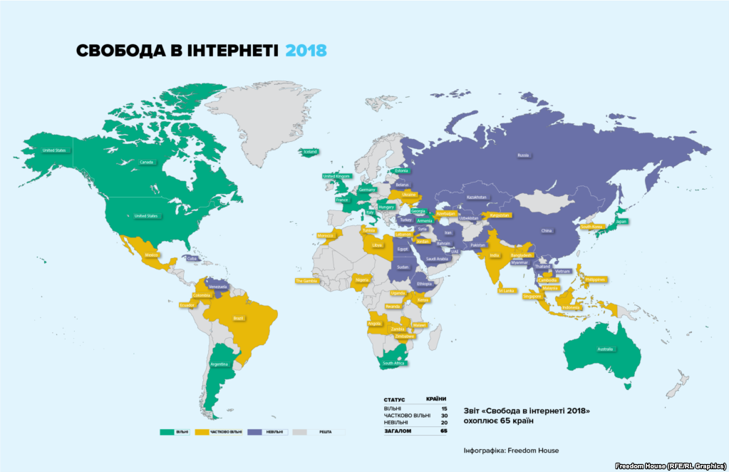 "Украина стремилась защитить свободу интернета на фоне конфликта с поддерживаемыми Россией сепаратистами и информационной войны с Кремлем. В 2017 году президент Петр Порошенко из соображений безопасности заблокировал несколько распространенных российских интернет-платформ; некоторые пользователи социальных медиа предстали перед судом за высказывания, которые были оценены как "призывы к экстремизму и сепаратизму". Жители оккупированных территорий имели проблемы с доступом к интернету, а журналисты подвергались техническим атакам через интернет и физическому насилию с обеих сторон конфликта", - говорится в отчете Freedom House "Свобода в интернете-2018".