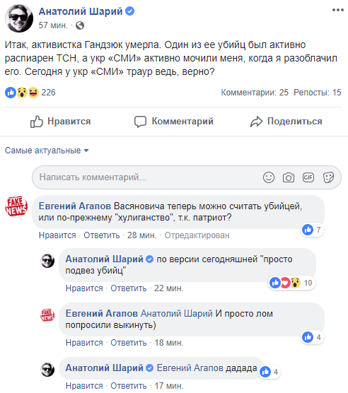 "Итак, активистка Гандзюк умерла. Один из ее убийц был активно распиарен ТСН, а украинские "СМИ" активно мочили меня, когда я разоблачил его. Сегодня у украинских "СМИ" траур, верно?", - отмечает блогер Анатолий Шарий.