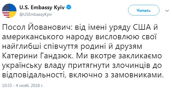 "От имени правительства США и американского народа выражаю свои соболезнования и глубокое сочувствие семье и друзьям Екатерины Гандзюк. Мы снова призываем власти Украины привлечь виновных к ответственности, включая заказчиков", - говорится в сообщении.