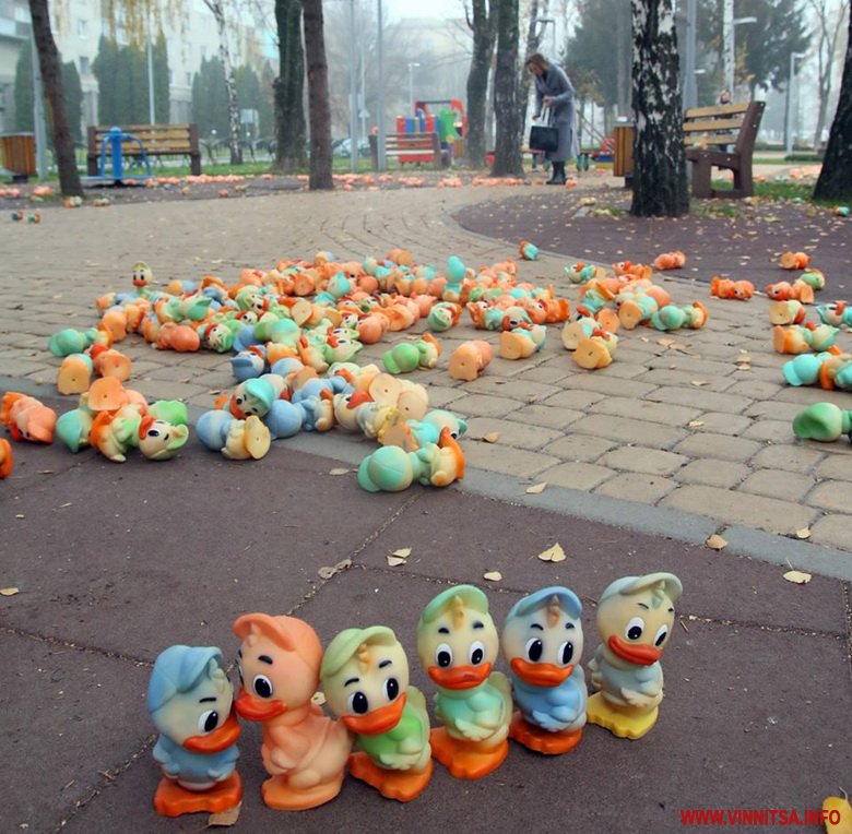 В Виннице полиция выясняет, кто в ночь на понедельник разбросал на одной из детских площадок тысячи резиновых игрушек. Как сообщает местное издание Вінниця.info, сегодня, 5 ноября, на детской площадке на проспекте Космонавтов местные жители обнаружили огромное количество резиновых утят.