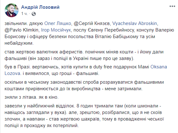 "Стал жертвой валютных аферистов. Помощник менял деньги – и ему дали фальшивые (он сейчас в полиции в Украине пишет об этом заявление). Был в Праге, хотел купить в duty free подарок маме, и оказалось, что деньги – фальшивые. Поскольку в чешском законодательстве попытка рассчитаться фальшивыми деньгами приравнивается к их производству – меня задержали. Сняли с самолета, как в кино. Завезли в ближайший участок, когда шмонали, то зачем-то заглядывали в уши. 8 часов держали там, но, в конце концов, разобрались, что я не совершил преступление, а наоборот – стал жертвой мошенников, поэтому в производстве чешской полиции я прохожу как потерпевший", – отметил Лозовой.