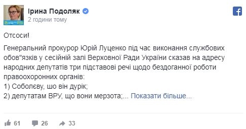 После этого на вопрос от нардепов, на каком основании Луценко позволяет себе неуважительное отношение к депутату, генпрокурор ответил: "Все это уже было в прошлом году, когда мерзавцы пытались примазаться к убийству Ноздровской и проливали здесь море лживых слез о том, что следствие ничего не делает. Когда обвиняемый в убийстве пошел в суд, ни один из этих мерзавцев не пошел даже в суд. Никого это не волнует! И сегодня похоронами Гандзюк занимается "Народный фронт", а не эти деятели, которые собирают на этом свои кровавые дивиденды. А если бывший председатель комитета, который должен был руководить всей антикоррупционной политикой, до сих пор не понимает разницу между процессуальным руководством и следствием, которого в ГПУ уже нет год, то это не председатель комитета, а просто недоросль, у которого диарея мозга выливается здесь, прямо в зале". Тут Луценко, очевидно, имел ввиду Егора Соболева, который до недавнего времени возглавлял антикоррупционный комитет Рады.