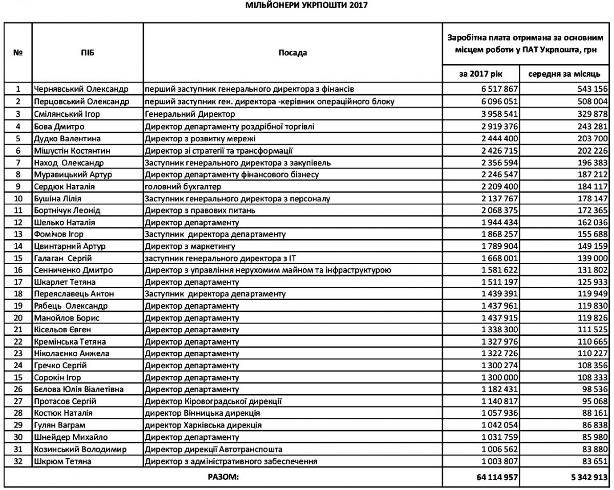 Вторую по величине зарплату получает заместитель гендиректора "Укрпочты" Александр Перцовский. Его заработок составляет 6 млн грн в год. При этом в 2016 году у него было всего 3,6 млн ривен. Что касается главы компании Игоря Смелянского, он оказался на третьем месте рейтинга зарплат. Его заработок составил почти 4 млн грн в год.