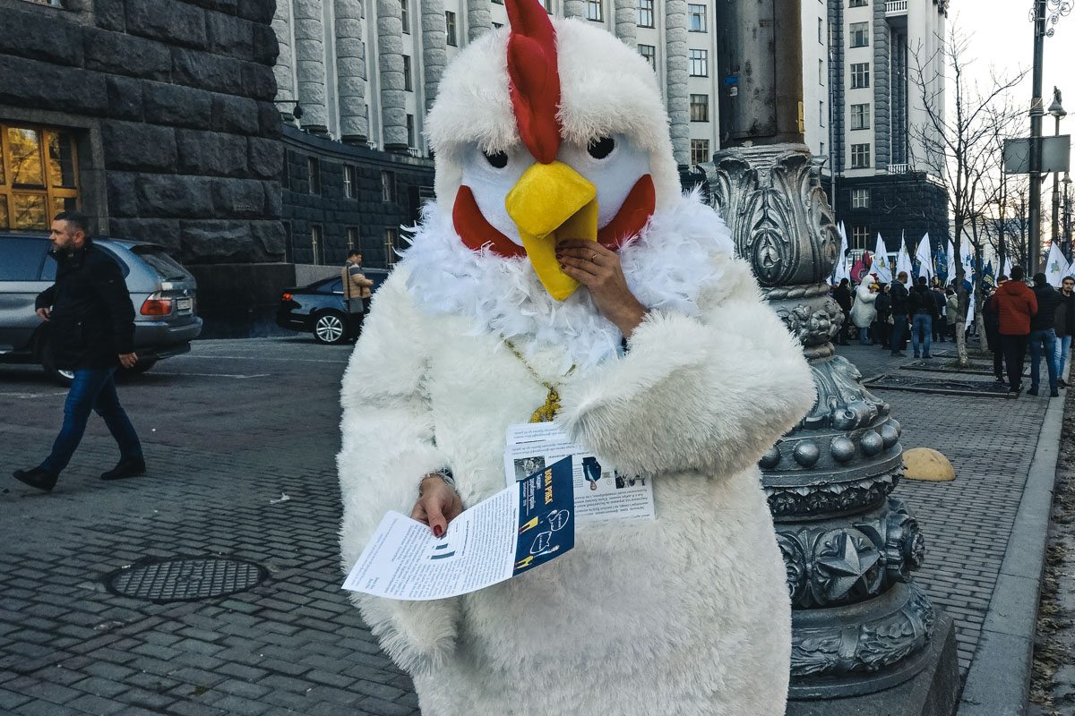 Также возле здания Кабинета министров проходит небольшой пикет, участниками которого стали люди, одетые в ростовые костюмы белых куриц. Всего их около пяти, они сообщают, что не представляют ни одну из организаций, а просто полагают, что сейчас куры в нашей стране живут лучше людей и выступают за улучшение жизни украинцев, повышение зарплат и понижение тарифов.