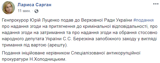 Генпрокурор Юрий Луценко подал в Верховную Раду Украины представление о даче согласия на привлечение к уголовной ответственности, задержание и избрание меры пресечения в отношении народного депутата Украины из группы "Воля народа" Станислава Березкина меры пресечения в виде содержания под стражей (ареста). Об этом сообщила пресс-секретарь генпрокурора Лариса Сарган на своей странице в Facebook.